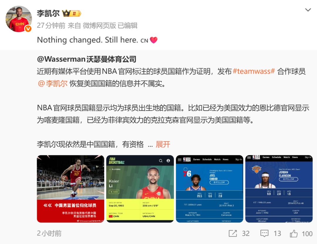 此前据热度新闻征引媒体报谈,李凯尔经纪公司Wasserman沃瑟曼体育公司针对李凯尔国籍坏话进行了回话。