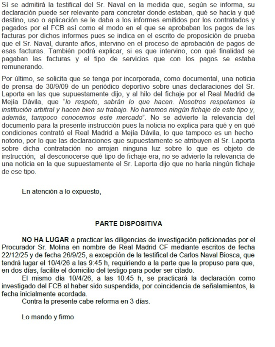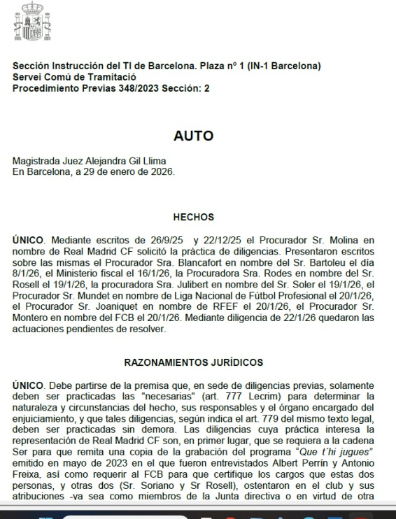 虎扑01月30日讯据多家西班牙媒体报说念,本周四,巴塞罗那第一访问法院1号法庭法官阿莱杭德拉-希尔-利马驳回了皇家马德里在内格雷拉案中提议的一项恳求。此前,皇马方面通过其代理讼师莫利纳,分散于2025年9月26日和12月22日向法院提交书面材料,请求获准查阅由KPMG、普华永说念或德勤等外部接洽机构出具的审计答复、尽责访问答复及法务取证答复,这些文献波及巴塞罗那俱乐部2003年至2021年的经济贬责情况。说明一份日历为1月29日的裁定文献,法院最终作出了不予领受的决定。
