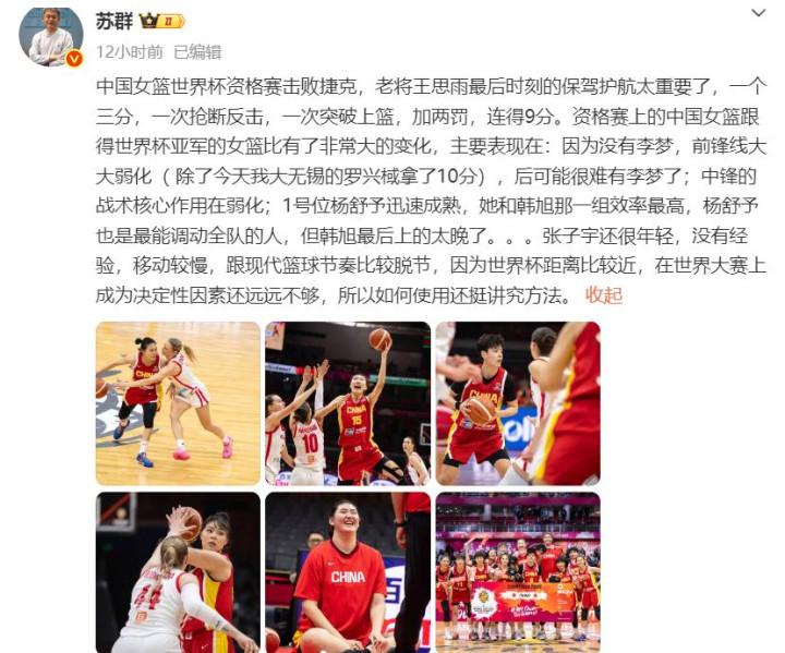 赛后,媒体东说念主苏群亦然发文点评中国队的证实,谈到张子宇时,指出:“张子宇还很年青,莫得教养,出动较慢,跟当代篮球节拍相比脱节,因为宇宙杯距离相比近,辞宇宙大赛上成为决定性身分还远远不够,是以怎么使用还挺崇拜要领”。