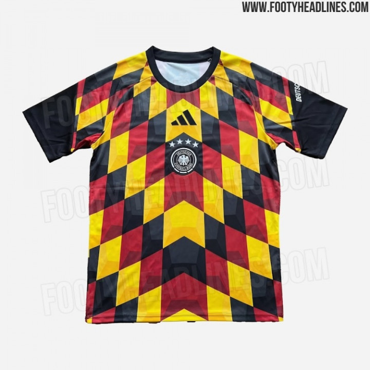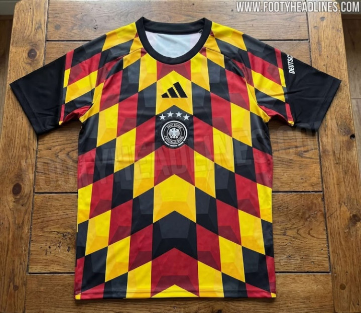 这款热身球衣禁受了极具视觉冲击力的缱绻,以德国传统的黑、红、金三色构建出显眼的几何V形图案,这一守旧缱绻灵感彰着致意了1994年好意思国寰宇杯时德国队的经典战袍。