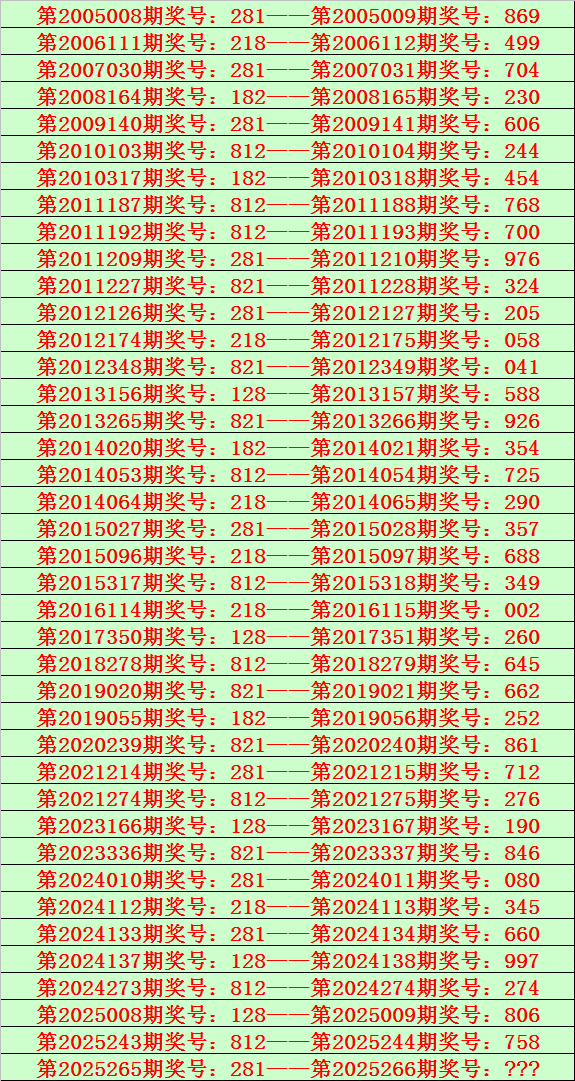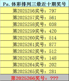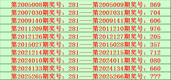 摆设三第2025265期开出奖号281,该号码直选类型历史上出现了10次,前9次开出之后期下期奖号为:869、704、606、976、205、357、712、080、660,见下表: